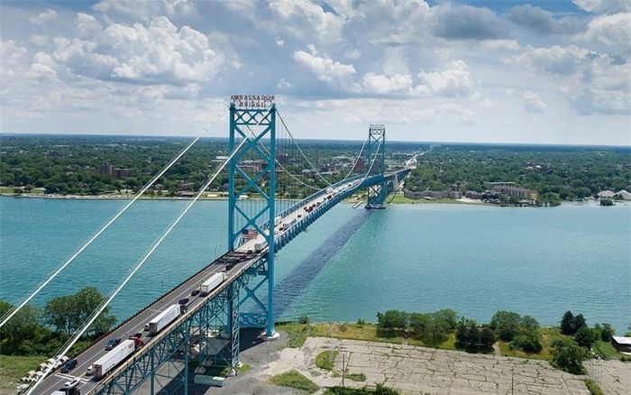 Cầu Ambassador, Biên giới Mỹ và Canada: Cầu Ambassador là một trong nhiều cây cầu bắc qua biên giới Mỹ - Canada nối Detroit, Michigan với Windsor, Ontario. Cây cầu treo trải dài hơn 2.300 m là cửa khẩu quốc tế nhộn nhịp nhất Bắc Mỹ. Người ta ước tính rằng khoảng 27% tổng giao thương giữa hai quốc gia này đi qua cầu Ambassador. Ảnh: AmbassadorBridge.