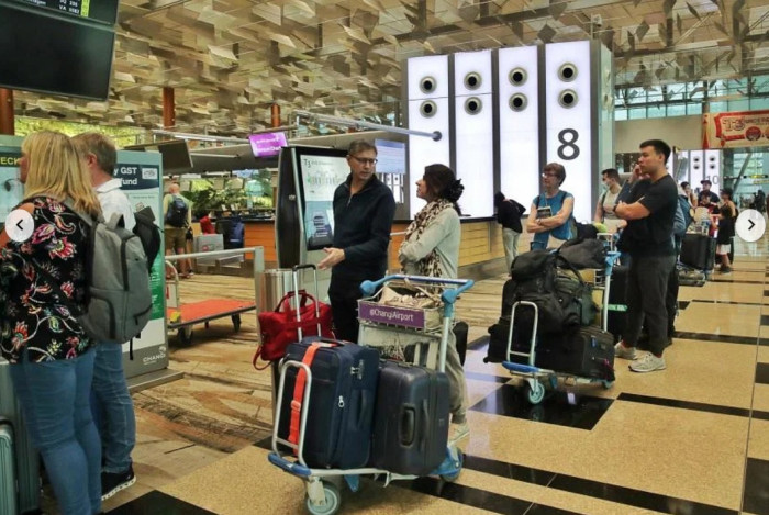 Hành khách chờ làm thủ tục lên chuyến bay tới Auckland, New Zealand tại Sân bay Changi, Singapore ngày 31/1. Ảnh - Straits Times
