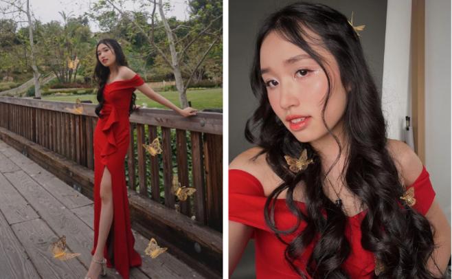 Trong ngày lễ hội cuối cùng của thời học sinh, Jenny Huỳnh chọn một chiếc váy đỏ nổi bật, đi giày cao gót và trang điểm long lanh. "Prom quá là sến!" - nữ YouTuber viết.