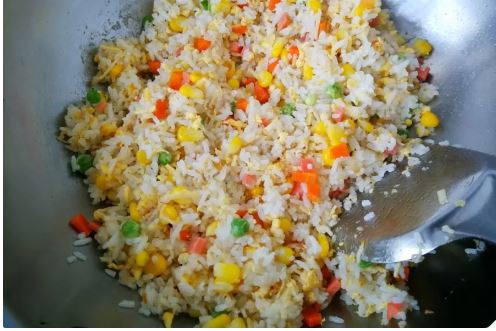 Ngoài màu vàng óng của trứng còn có thêm màu xanh của đậu Hà Lan, cam rực của cà rốt mà vàng tươi của ngô ngọt trông cực kỳ đẹp mắt.