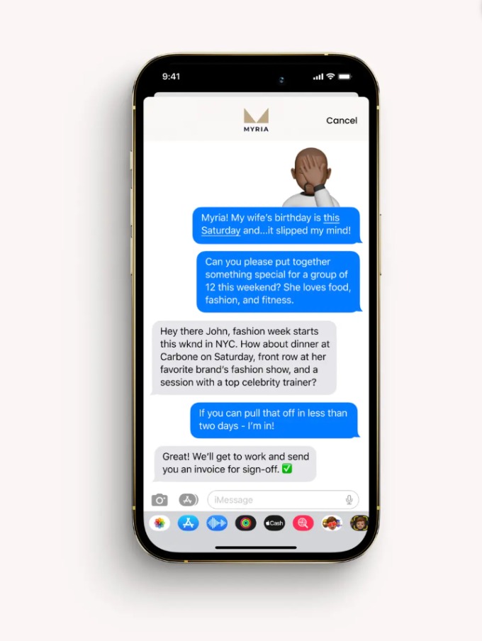 Ứng dụng này cũng được thiết kế tab "trò chuyện", cho phép các thành viên liên lạc trực tiếp với nhân viên của Myria nếu gặp khó khăn. Trong quá trình dùng thử, phóng viên của NyPost đã thấy tin nhắn từ một thành viên mong muốn thuê hướng dẫn viên dạy lướt sóng và vệ sĩ cho kỳ nghỉ ở Costa Rica (Mỹ). Một triệu phú khác lại nhờ giúp tìm gấp chỗ ở sang trọng cùng đoàn nhân viên phục vụ cho chuyến đi tự phát tới thánh địa Machu Picchu (Peru).