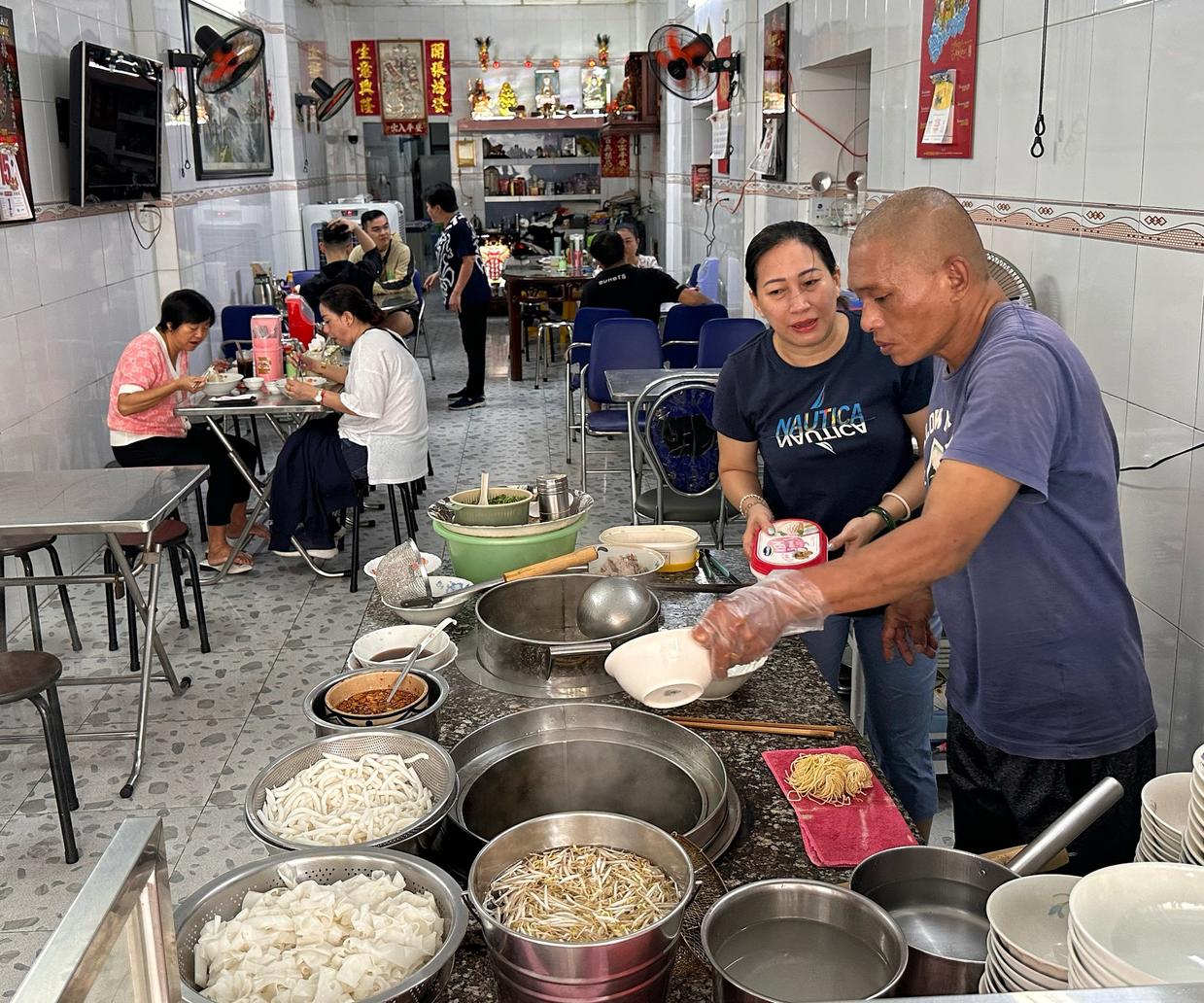 Trong quán, bốn anh chị em gốc Hoa trong gia đình của anh Thành mỗi người một việc, làm nhanh nhất, tỉ mỉ nhất những phần hủ tiếu, mì, bánh canh… mang ra bàn cho khách để không ai phải chờ đợi lâu. Tiếng cười, nói chuyện trong quán nhộn nhịp.