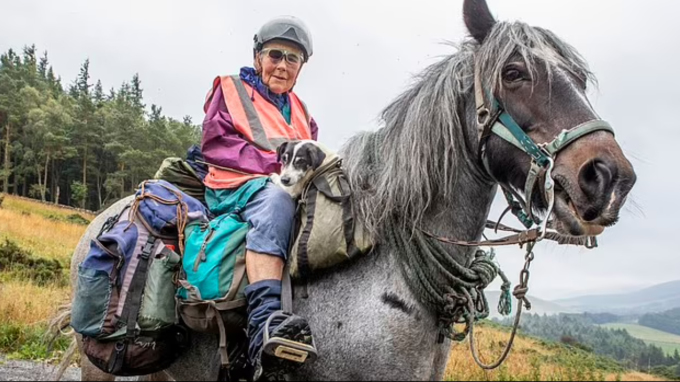 Đồng hành cùng Jane Dotchin, 82 tuổi, trong chặng đường từ hạt Northumberland, Anh, đến thành phố Inverness, Scotland, năm nay là con ngựa Diamond 15 tuổi và con chó Dinky 12 tuổi. Con chó nhỏ được Jane đặt vào một chiếc túi treo bên yên. "Con vật khá hạnh phúc khi ngồi trong đó và nhìn ngắm thế giới", Jane nói.