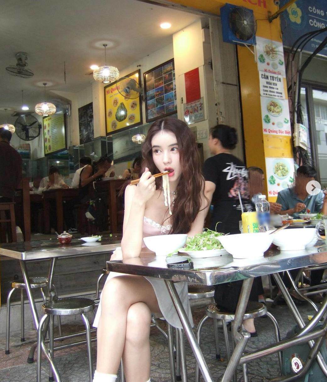 Trên trang cá nhân người đẹp khoe khoảnh khắc ăn diện quyến rũ, mát mẻ và hào hứng thưởng thức mì Quảng - một trong các món ăn đặc trưng của đất nước ta.