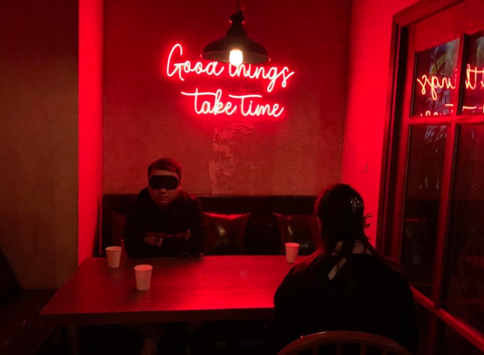 Khi vào quán, Chi được phát một chiếc bịt mắt và ngồi đối diện một chàng trai. Cả hai có 15 phút trò chuyện, hỏi han về tính cách và hình mẫu lý tưởng của nhau. Chi gật đầu đồng ý để tìm hiểu sâu hơn đối phương. Trong trường hợp không hài lòng, cô được quyền giơ tay ra hiệu đổi bạn nam khác.