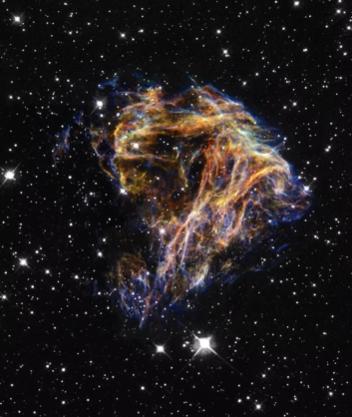 Trong bức ảnh NASA vừa công bố dịp năm mới cho thấy, giữa vật thể đang lao thẳng về phía Ngân Hà xuất hiện thứ giống như vụ nổ, đang bung tỏa những sợi tơ ánh sáng mỏng manh đi khắp mọi hướng. Cụm "pháo hoa" bí ẩn được xác định là một siêu tân tinh, tức vụ nổ sao, đánh dấu cái chết của một thiên thể.