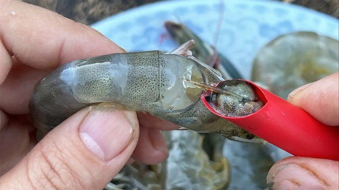 Lấy một đoạn ống hút có kích thước vừa phải, có thể hút vừa phần dạ dày tôm. Sau đó, kéo phần khớp nối giữa đầu và thân tôm, bẻ nhẹ ra rồi dùng đầu ống hút đâm vào, múc sạch phần dạ dày. Giữ lấy thân tôm đồng thời kéo phần chỉ tôm ra. Chỉ cần vài giây đã thực hiện xong.