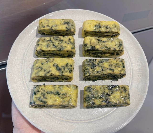 Món ăn này khá lạ miệng. Bình thường mọi người vẫn hay nghe món trứng ngải cứu, món ăn trứng cuộn lá tía tô khá lạ miệng.