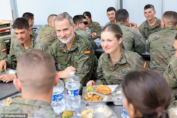 Sau đó, 2 cha con ngồi cạnh nhau khi cùng thưởng thức bữa trưa với các sinh viên quân sự tại trung tâm huấn luyện quốc gia. Nữ vương tương của Tây Ban Nha cũng được chụp ảnh đội mũ bảo hiểm và trang bị ngụy trang khi cô thực hiện các bài tập quân sự cùng đồng đội.