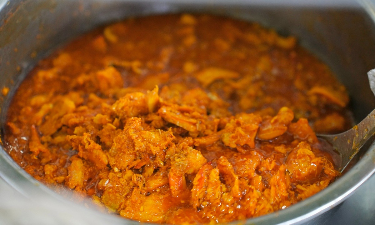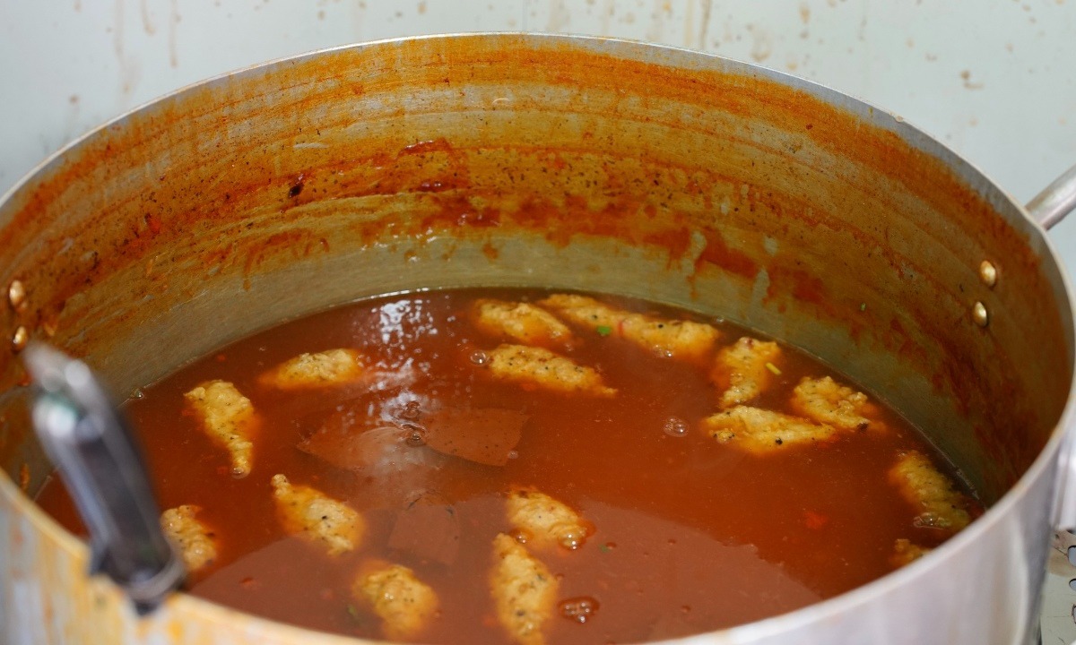 Nước dùng bánh canh cua ninh từ xương heo, thêm bột năng để tạo độ sệt. Chị Hồng cho thêm huyết heo và con suông vào nồi nước dùng để tăng thêm độ ngọt và hương vị đậm đà.
