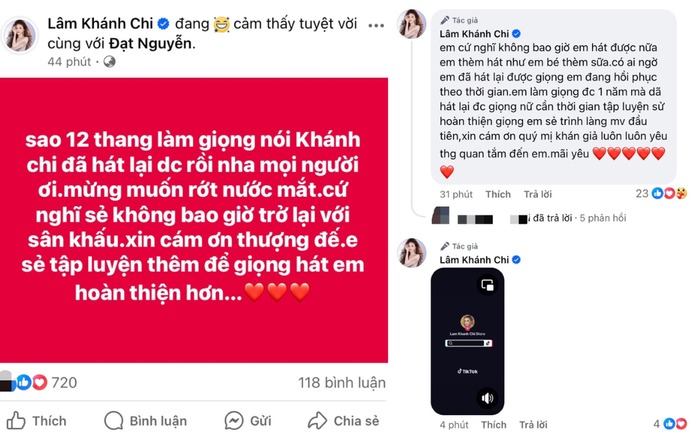 Ngày 29/5, Lâm Khánh Chi thông báo tin bản thân cô đã có thể hát trở lại sau một năm phẫu thuật dây thanh quản: "Tôi cứ nghĩ không bao giờ tôi hát được nữa tôi thèm hát như em bé thèm sữa. Có ai ngờ tôi đã hát lại được, giọng tôi đang hồi phục theo thời gian". Cô cho biết để có thể hát giọng nữ chỉn chu, bản thân cần thời gian tập luyện.