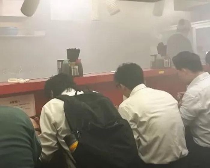 Thực khách vẫn ngồi ăn mì dù khói từ đám cháy tràn ngập trong nhà hàng. Ảnh: FNN.