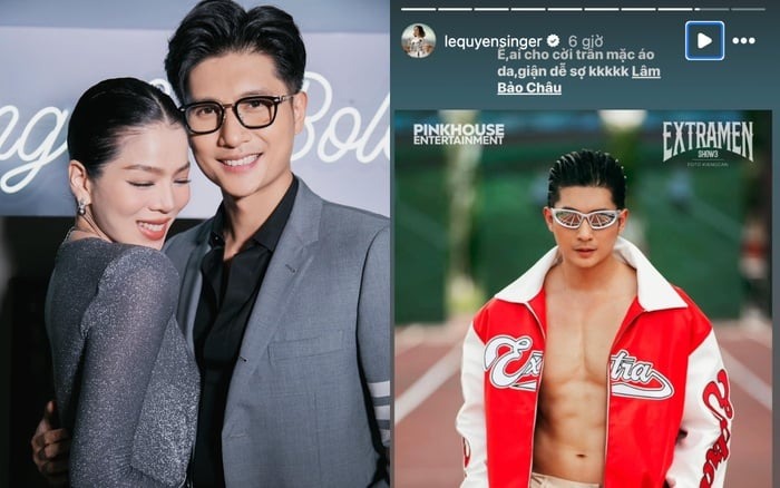 Sáng ngày 14/6, Lệ Quyên chia sẻ lại hình ảnh Lâm Bảo Châu mặc áo khoe cơ bụng. Cô liên cảm thấy giận dỗi: "Ê, ai cho cởi trần mặc áo da, giận dễ sợ". Chia sẻ của Lệ Quyên khiến dân tình thích thú.