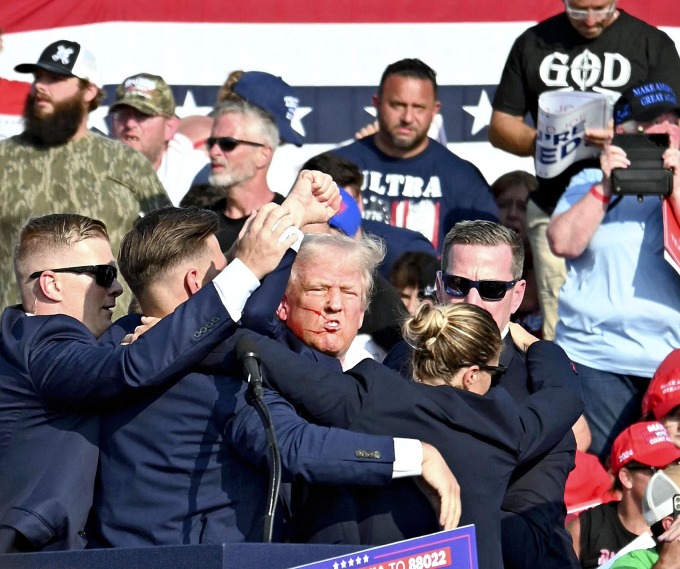 Ông Trump được các mật vụ hộ tống khỏi sân khấu sau vụ ám sát hụt ở Butler, Pennsylvania ngày 13/7. Ảnh: AFP