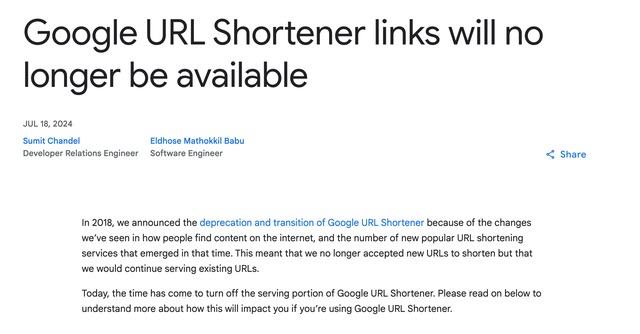 Google sẽ sớm đóng góp thêm vào vấn đề "link chết" (link rot) trên Internet bằng việc ngừng hoạt động dịch vụ Google URL Shortener vào năm 2025.