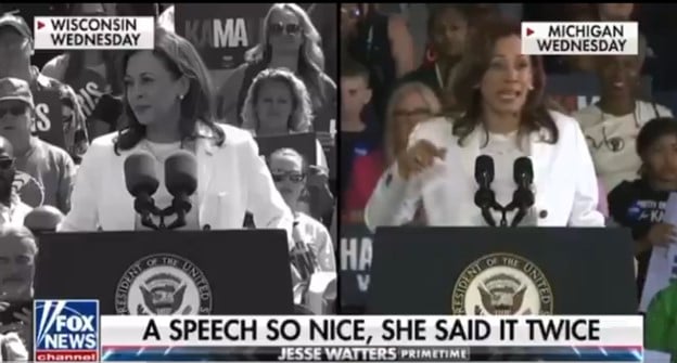 Jesse Watters đã chia sẻ đoạn phim về hai bài phát biểu của Harris vào thứ Tư: một ở Eau Claire , Wisconsin và một ở Detroit , Michigan. Ông đã chiếu chúng cạnh nhau để cho thấy Harris lặp lại từng từ và thậm chí còn thể hiện những biểu cảm khuôn mặt tương tự trong suốt bài phát biểu.
