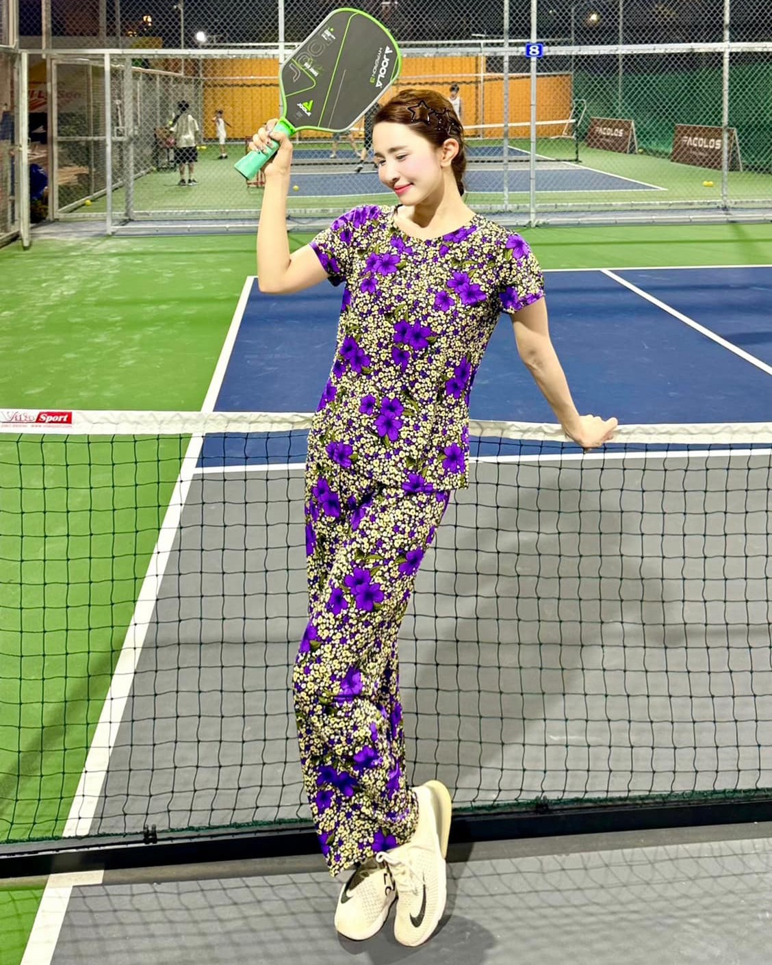 Trước những tranh cãi xung quanh việc mặc gợi cảm đi chơi pickleball, 'cá sấu chúa' Quỳnh Nga chọn đồ bộ đi ngược xu hướng.