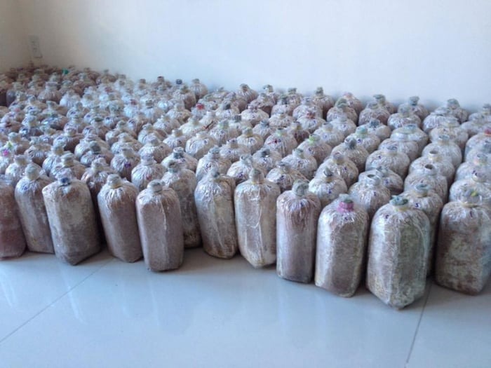 Mỗi tầng rơm cho vào túi nilon dày khoảng 5 - 7cm và mỗi túi nilon sẽ làm được 4 tầng nấm. Mỗi túi nilon sẽ cấy khoảng 50g giống nấm.