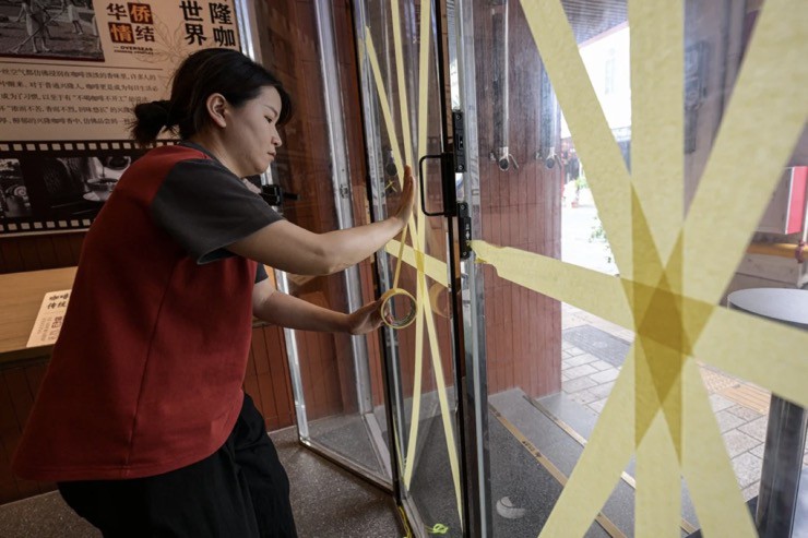 Một nhân viên quán cà phê ở thủ phủ Hải Khẩu, tỉnh Hải Nam dán băng dính chữ X lên cửa kính để ứng phó bão Yagi đổ bộ. Ảnh: Tân Hoa Xã.
