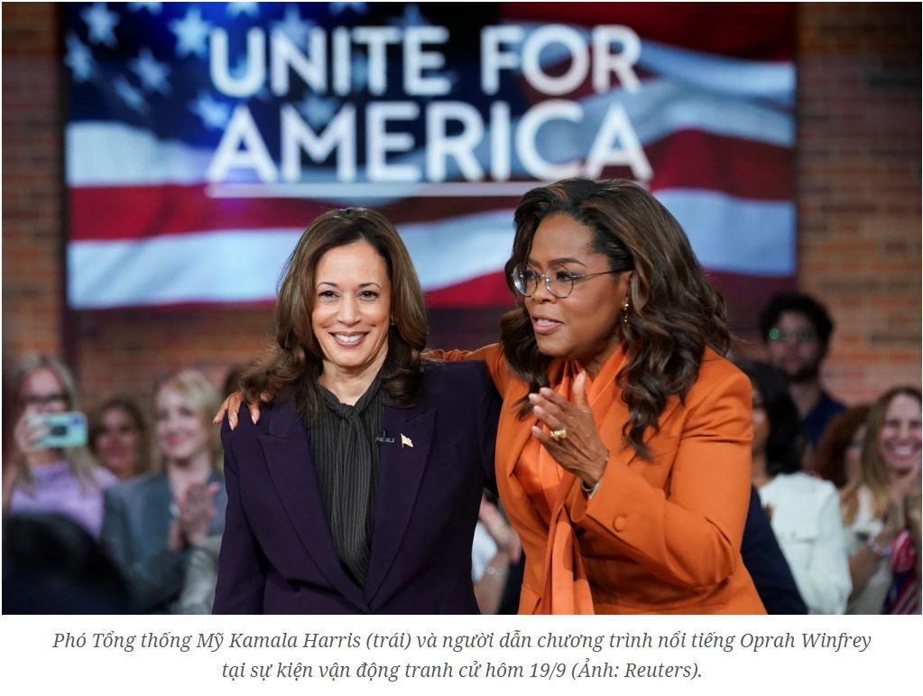 Nữ hoàng truyền hình Winfrey, người đã lên tiếng mạnh mẽ ủng hộ bà Harris trong cuộc chạy đua vào Nhà Trắng, dành nhiều lời khen ngợi dành cho bà Harris, người trở thành ứng viên tổng thống đảng Dân chủ sau khi Tổng thống Biden rút khỏi cuộc đua.