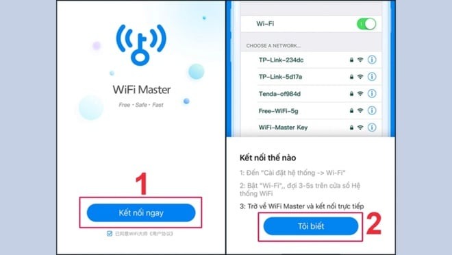 Bước 1: Sau khi tải ứng dụng thành công, bạn mở WiFi Master lên và chọn Kết nối ngay. Ứng dụng sẽ hiện lên thông báo hướng dẫn bạn kết nối ứng dụng, hãy chọn Tôi biết.