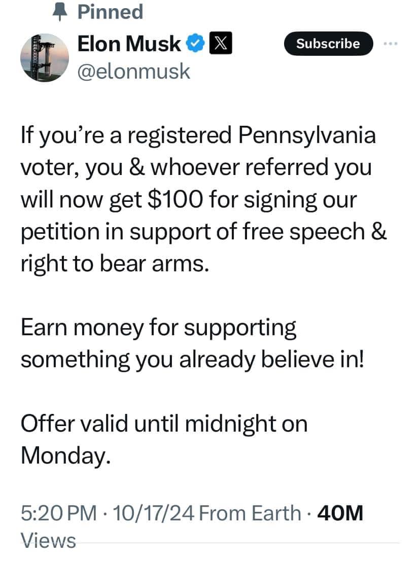 Elon Musk vừa tuyên bố sẽ rút thăm trúng thưởng 1 TRIỆU đô la mỗi ngày, cho một người ngẫu nhiên nằm trong danh sách những người ghi danh trong America PAC của ông ngoài số tiền thưởng đương nhiên $47 hay $100. Website Ghi danh trong hình .