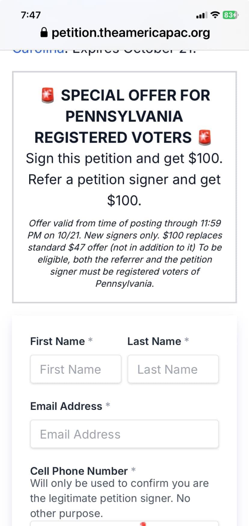 Nếu bạn là cử tri đã ghi danh ở Pennsylvania, bạn và bất cứ ai mà bạn giới thiệu sẽ nhận được 100 đô la , khi ký vào bản kiến nghị của America PAC ủng hộ tự do ngôn luận và quyền mang vũ khí.