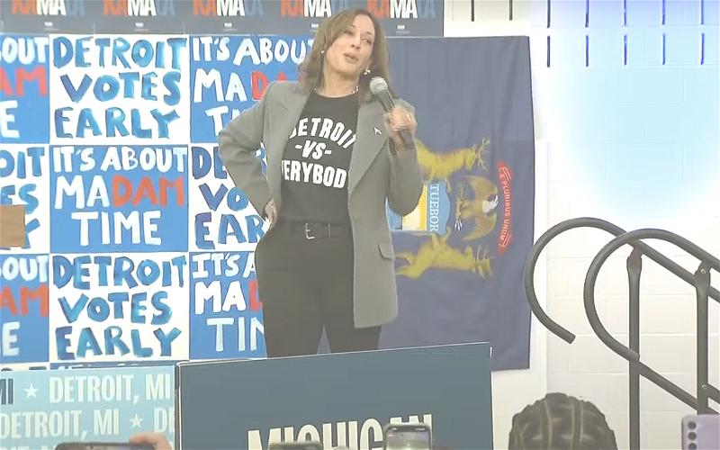 blankBà Harris vận động tại Detroit và chiếc áo T-shirt có dòng chữ "Detroit vs. Everybody."