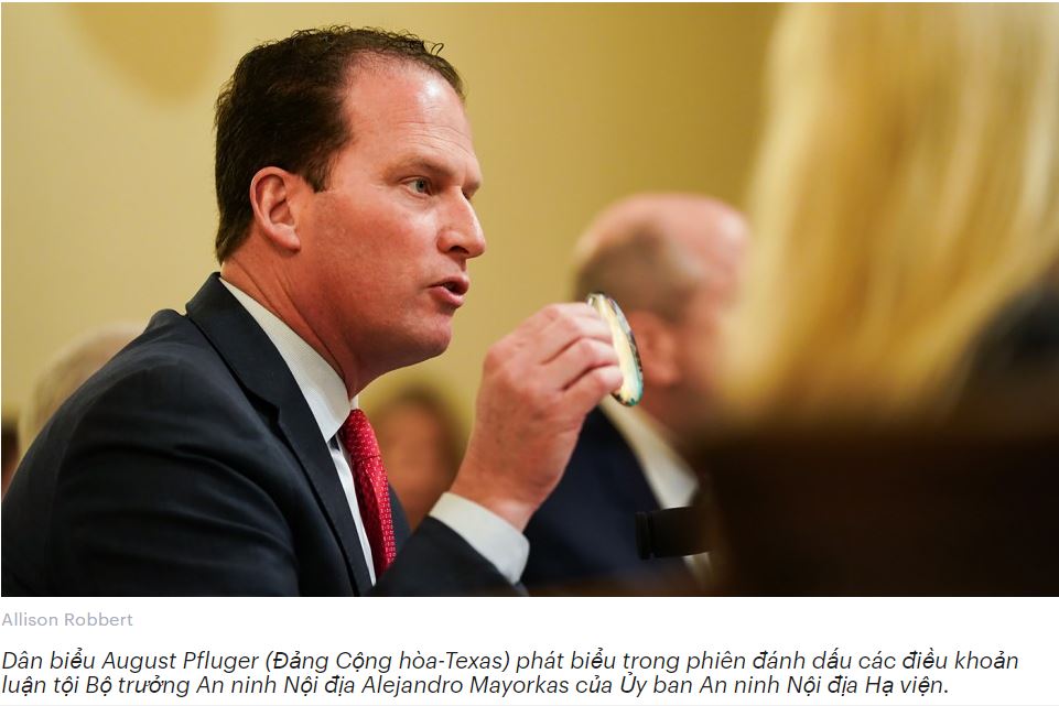 Dân biểu August Pfluger (Đảng Cộng hòa-Texas) phát biểu trong phiên đánh dấu các điều khoản luận tội Bộ trưởng An ninh Nội địa Alejandro Mayorkas của Ủy ban An ninh Nội địa Hạ viện.