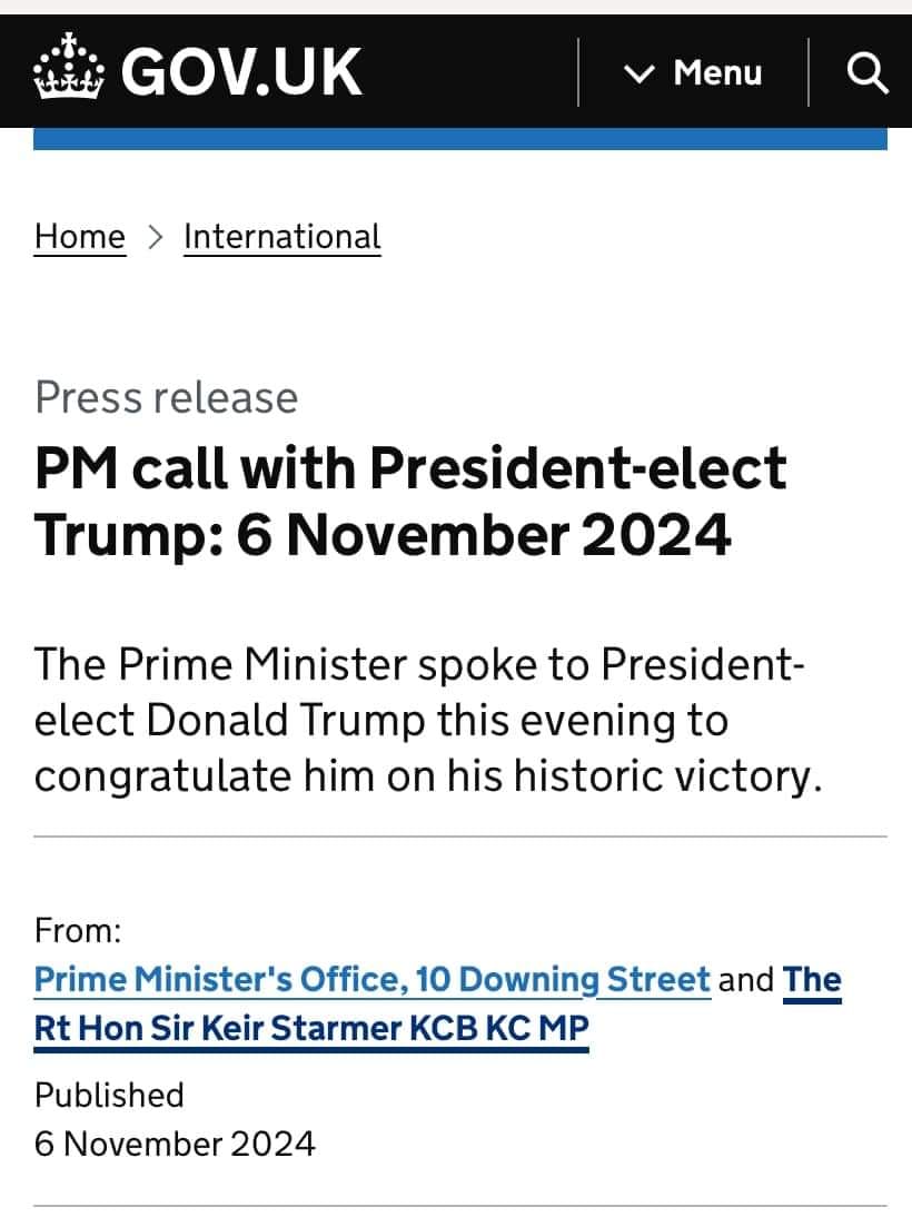 Mỹ và Anh đang trong tình trạng xích mích trầm trọng vì thủ tướng Anh nói ông Trump là quân phiệt và quốc hội Anh đã đưa người đến Mỹ vận động bầu cử cho Kamala. Vừa sau ngày bầu cử, thủ tướng Anh lật đật gọi ông Trump xin lỗi về chuyện cũ.