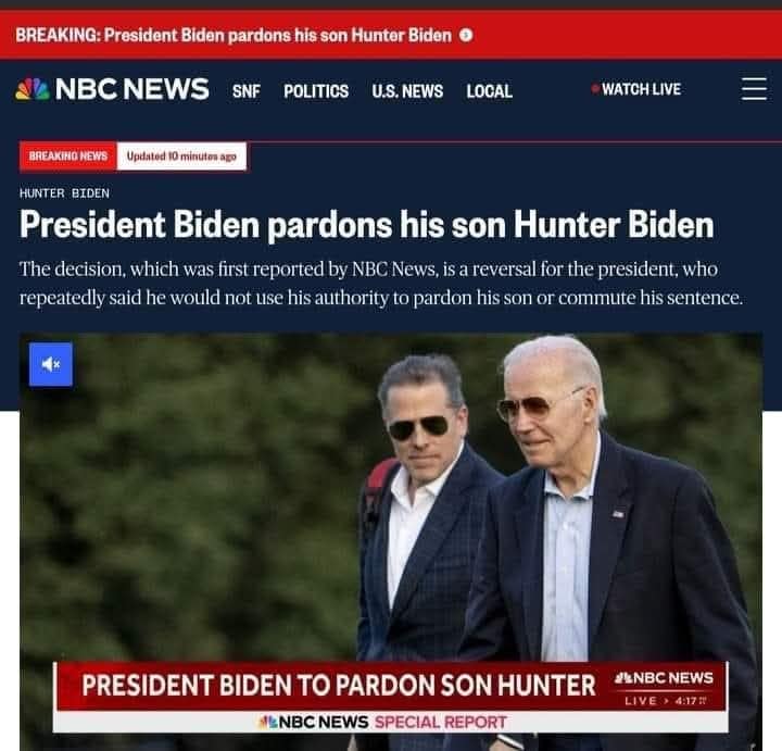 Dù lệnh ân xá của Joe Biden dành cho Hunter là “Hoàn toàn và Vô điều kiện” diễn ra chỉ 13 ngày trước khi toà án liên bang Mỹ tuyên án về tội sử dụng súng trái phép và trốn thuế đối với ông Hunter.