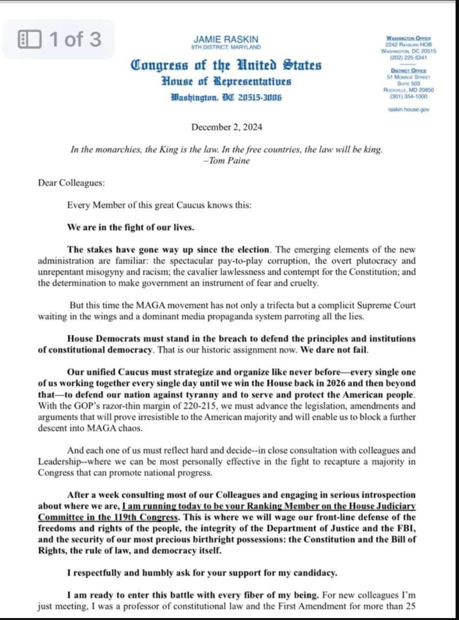 -Jamie Raskin là Dân biểu thuộc đảng Dân chủ của TB Maryland', đồng thời ông ta cũng là Thành viên của Ủy ban J6 trong Quốc hội trước đây . Hôm nay Jamie Raskin vừa tuyên bố rằng ông sẽ chính thức ứng cử vào vị trí thành viên cấp cao của Ủy ban Tư pháp Hạ viện tại Quốc hội khóa 119 để ông có thể lănh đạo đảng Dân chủ phản đối nỗ lực cải cách Bộ Tư pháp và FBI của Tổng thống Trump.