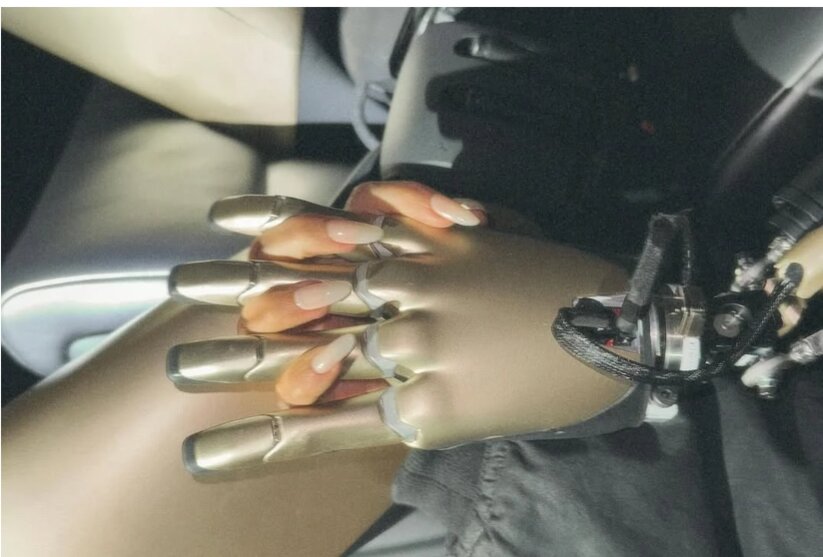 Một bức ảnh khác có cảnh cô nắm tay robot khi ngồi trong chiếc Tesla Cybertruck màu vàng, kèm theo một icon người ngoài hành tinh ở dòng chú thích.