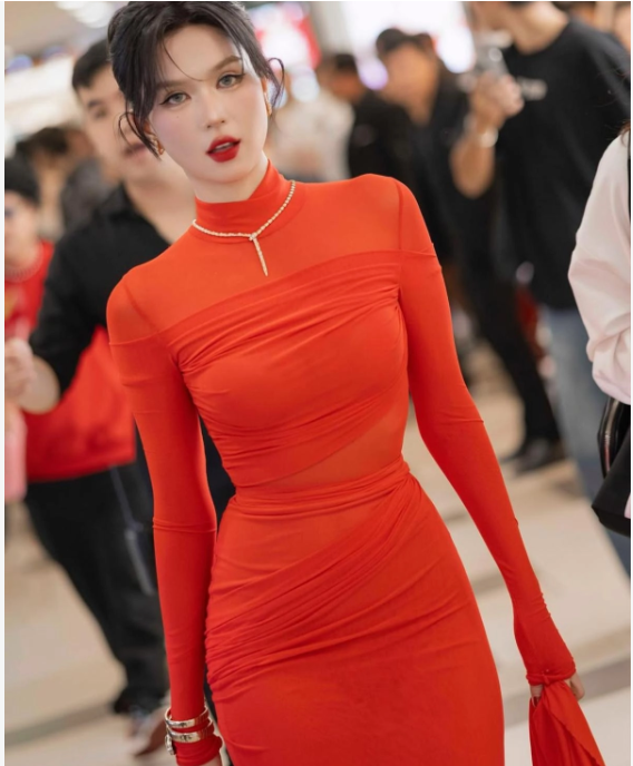 Khác với hình ảnh "hở bạo" hay cắt xẻ táo bạo như trước, Ngọc Trinh sải trước trên thảm đỏ với trang phục kín cổng cao tường. "Nữ hoàng nội y" khoác lên người mẫu váy dạ hội ôm sát, form dáng dài quét đất. Thiết kế này được thực hiện từ chất liệu mỏng manh, đôi chỗ xuyên thấu và mang tông màu đỏ nổi bật.