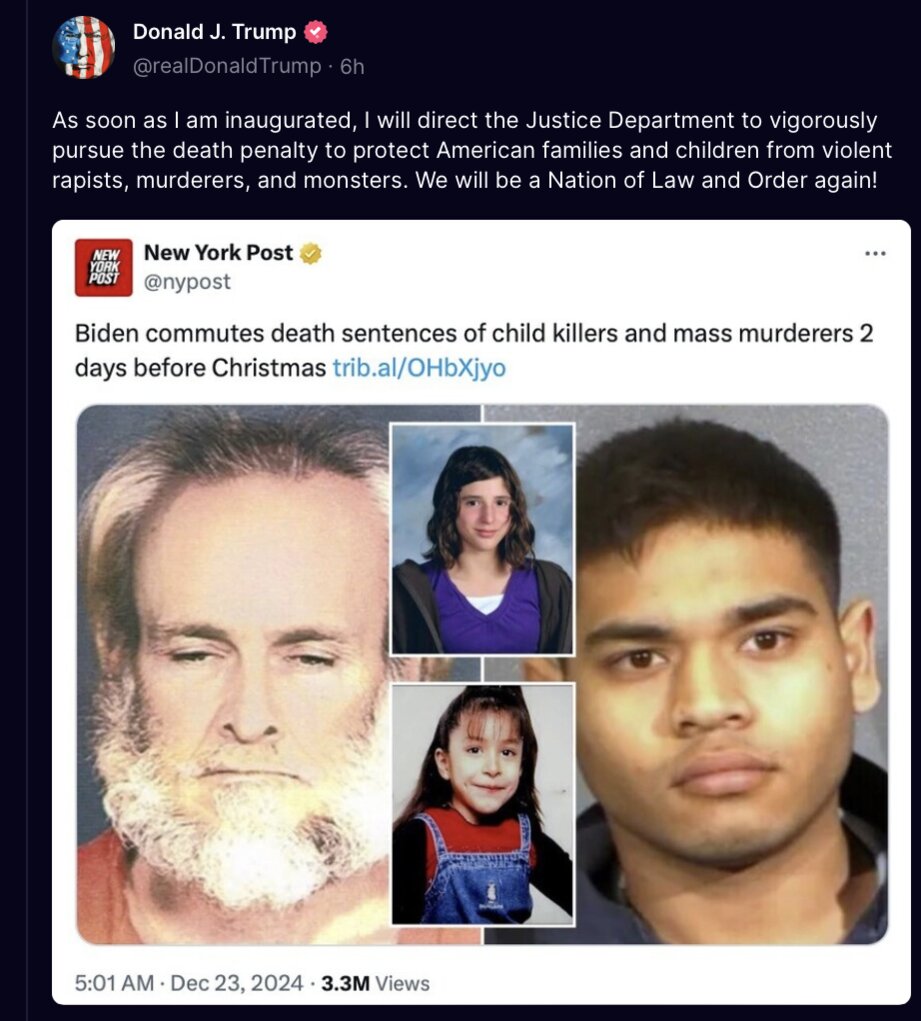 Tổng thống đắc cử Mỹ Donald Trump tuyên bố trên mạng xã hội Truth Social vào ngày 24/12 rằng: "Ngay sau khi nhậm chức vào tháng tới, tôi sẽ “chỉ đạo Bộ Tư pháp tích cực theo đuổi án tử hình để bảo vệ các gia đình và trẻ em Mỹ khỏi những kẻ hiếp dâm, giết người và quái vật bạo lực. Chúng ta sẽ lại là một Quốc gia của Luật pháp và Trật tự”. Ảnh chụp màn hình bài đăng trên mạng xã hội Truth Social của Tổng thống đắc cử Mỹ Donald Trump
