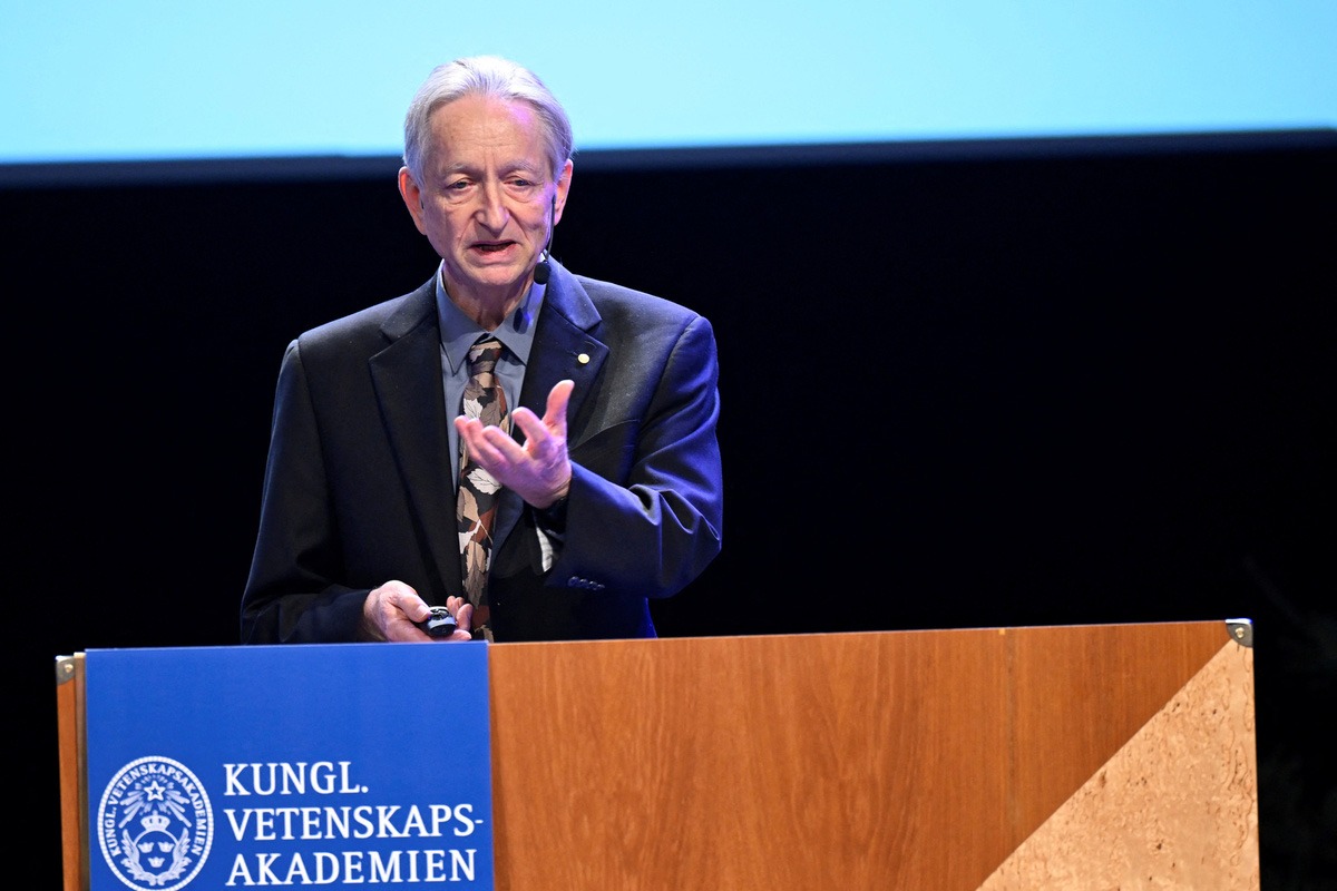 Nhà khoa học máy tính Geoffrey Hinton phát biểu trong bài diễn thuyết về Giải Nobel Vật lý năm 2024 tại thủ đô Stockholm, Thụy Điển - Ảnh: REUTERS