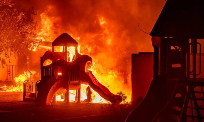 Lửa trong đám cháy Eaton đốt cháy một sân chơi ở khu dân cư tại Pasadena, California hôm 7/1. Ảnh: Josh Edelson