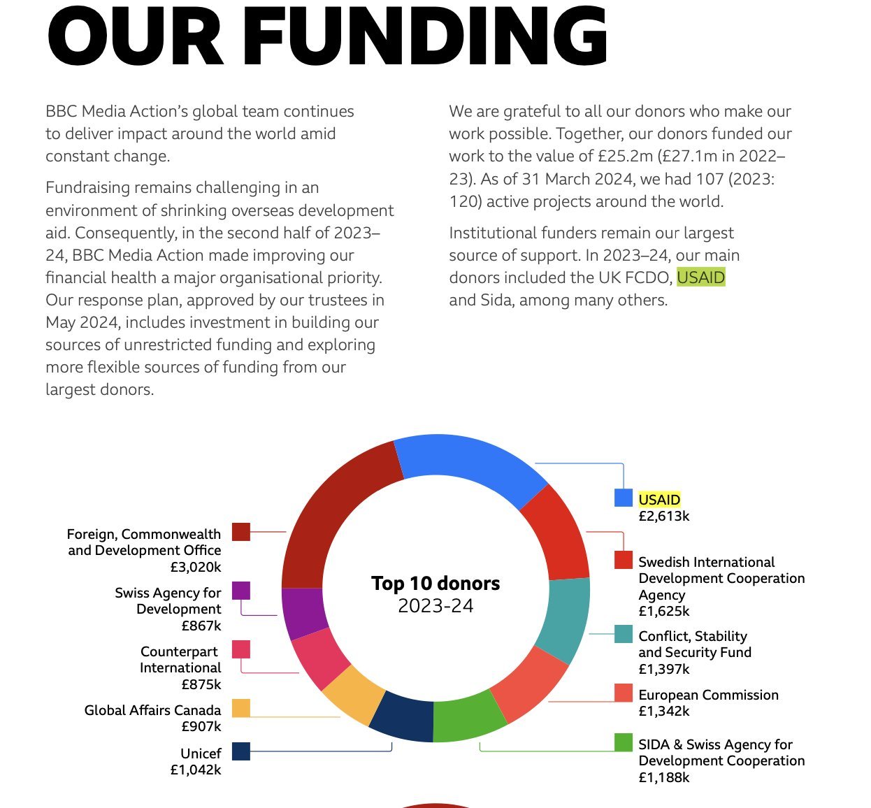 BBC Media Action, một tổ chức từ thiện gắn liền với BBC, đã nhận được 3,3 triệu đô la từ USAID trong năm 2023-24, khiến cơ quan Hoa Kỳ này trở thành một trong những nhà tài trợ hàng đầu của mình.