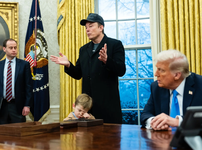 Elon Musk đứng trong Phòng Bầu dục, nói chuyện với các phóng viên, trong khi Tổng thống Trump ngồi bên bàn làm việc và con trai của ông Musk đứng gần cha mình hôm 11/2. Ảnh: The New York Times