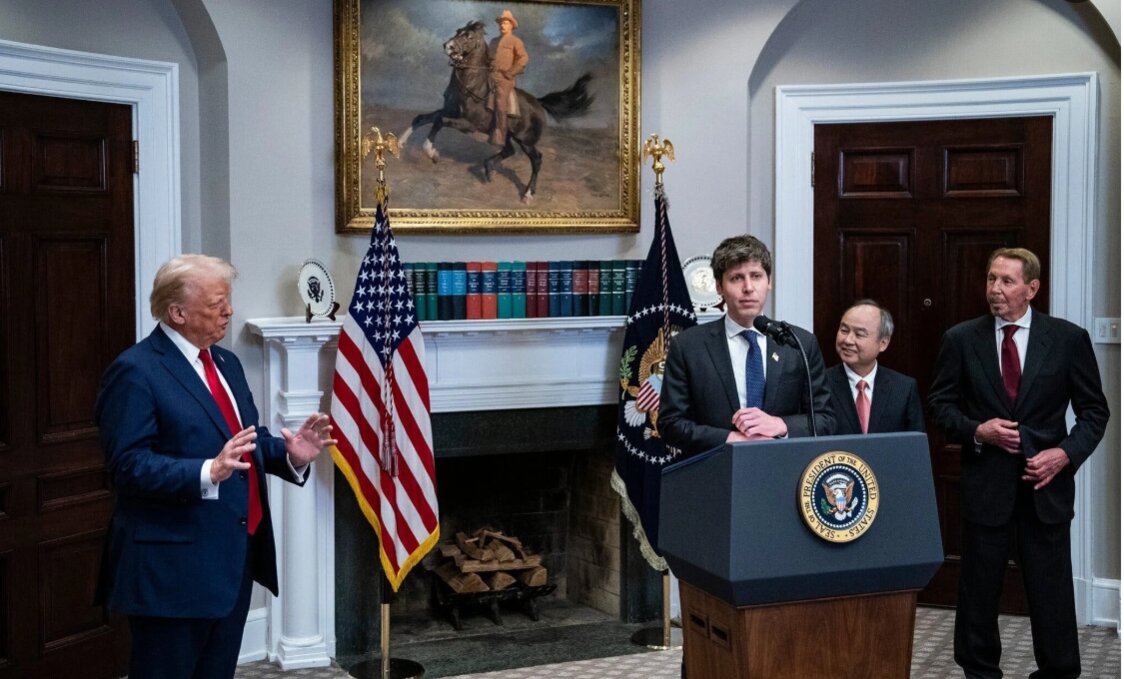 Tổng thống Donald Trump, Sam Altman, Masayoshi Son và Larry Ellison trong buổi họp báo công bố dự án Stargate tại Nhà Trắng. Ảnh: New York Times.
