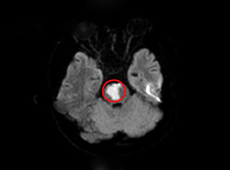 Kết quả chụp MRI sọ não bệnh nhân phát hiện khối nhồi máu tiểu não, cầu não do tắc động mạch thân nền. Xét nghiệm máu có rối loạn lipid máu, một yếu tố nguy cơ dẫn đến các vấn đề tim mạch và mạch máu não. Người bệnh được phát hiện bất thường trong hệ gene làm tăng nguy cơ tạo huyết khối tắc mạch.