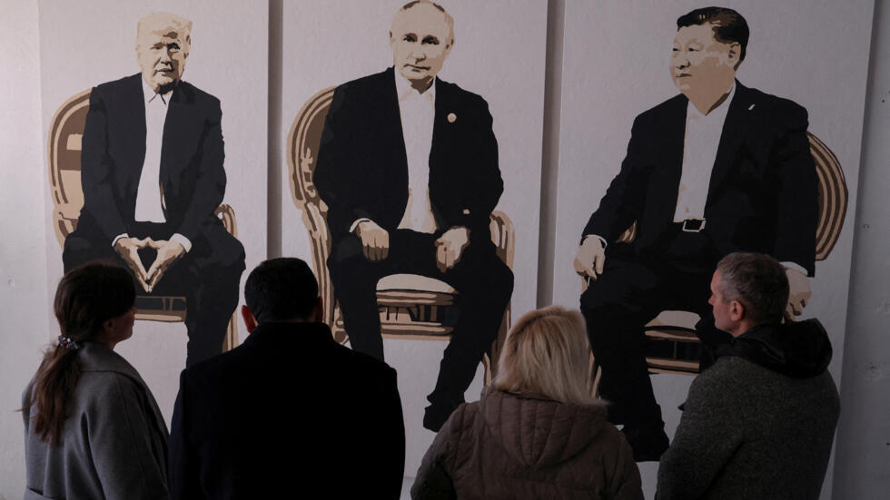Du khách đứng trước một tác phẩm nghệ thuật có hình tổng thống Hoa Kỳ Donald Trump, tổng thống Nga Vladimir Putin và chủ tịch Trung Quốc Tập Cận Bình tại một phòng trưng bày nghệ thuật ở công viên Livadia ở Yalta, Crimee, ngày 08/02/2025. REUTERS - Alexey Pavlishak