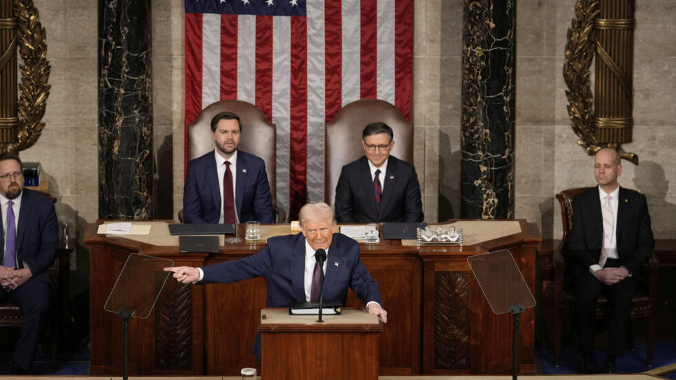 Tổng thống Mỹ Donald Trump phát biểu trước Quốc Hội lưỡng viện, đồi Capitol, Washington, Hoa Kỳ, ngày 04/03/2025. © Ben Curtis / AP