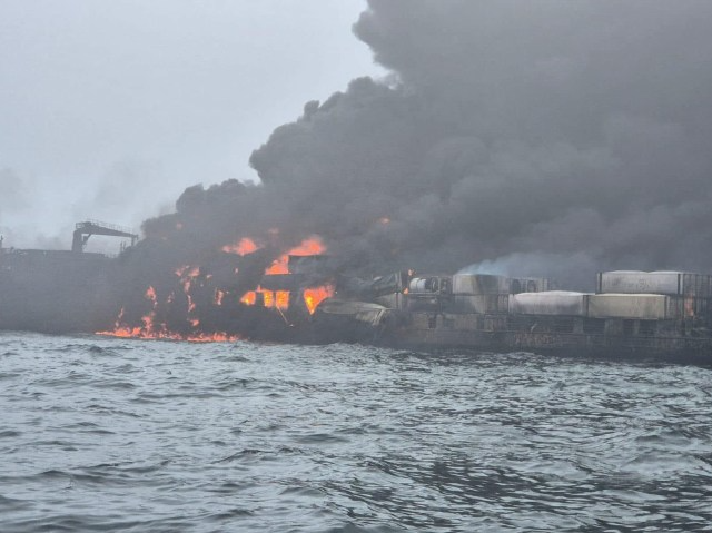 Hai tàu bốc cháy sau vụ va chạm. Ảnh: @Tessaronnews