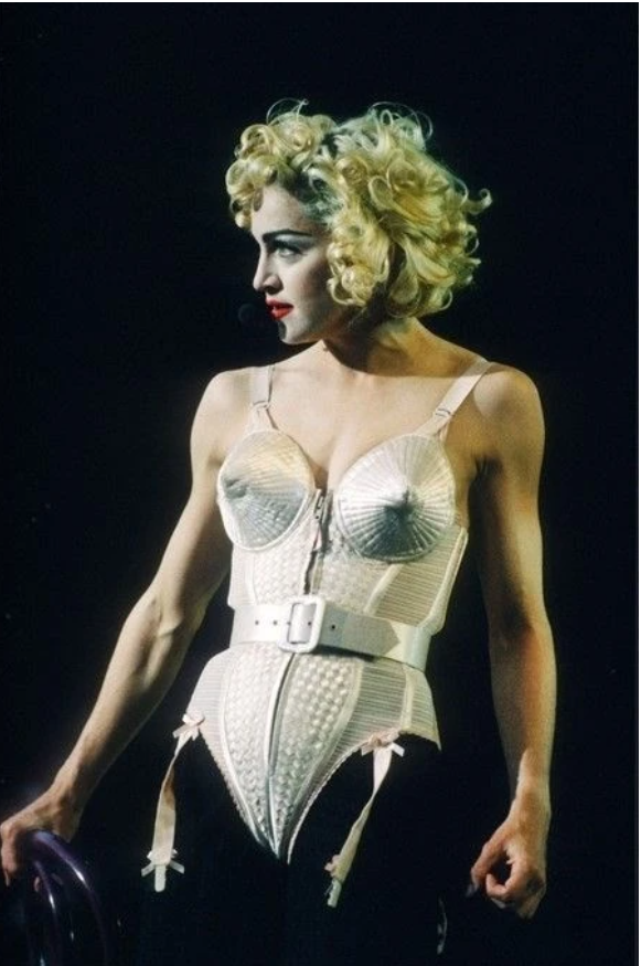 Lấy ý tưởng từ áo ngực hình viên đạn của thập niên 50, nhà thiết kế người Pháp Paul Gaultier đưa thiết kế này trở lại sàn runway vào năm 1983. Trong chuyến lưu diễn Blonde Ambition năm 1990, Madonna yêu cầu Jean Paul Gaultier thực hiện riêng mẫu áo ngực hình chóp nón để diện trên sân khấu. Đây là món đồ từng xuất hiện trên sàn diễn năm 1987. Song, theo yêu cầu của Madonna, Gaultier tự tay biến tấu, điều chỉnh, giúp chiếc áo ngực trở nên phù hợp với phong cách của nữ hoàng nhạc Pop. Thiết kế này sau đó bị đánh giá là phản cảm, gợi dục, nhận về nhiều ý kiến trái. Ảnh: @madonnaoutfits.