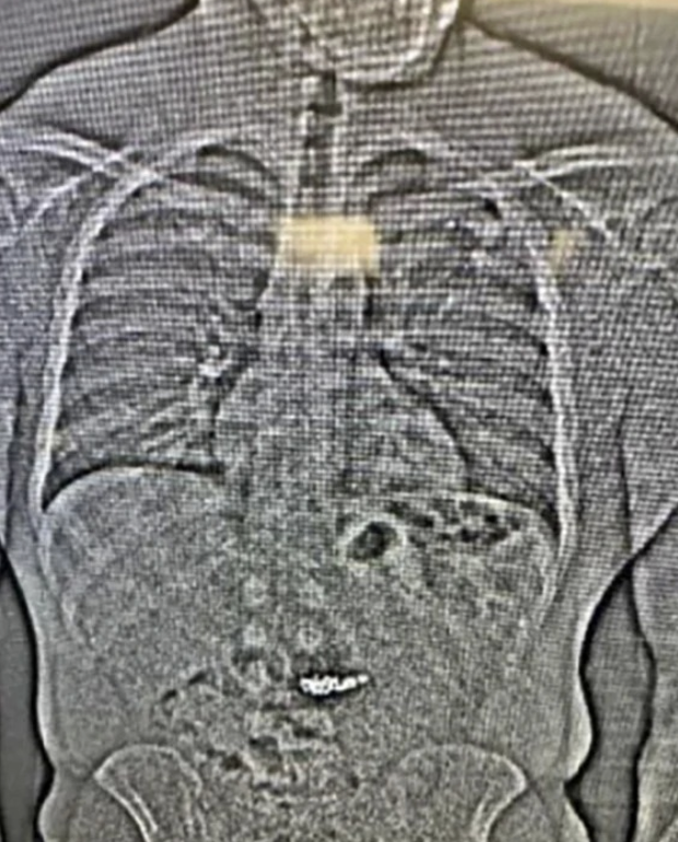 An X-ray of his torso shows what the Orlando Police Department believed to be the diamond earrings — a white mass shining brightly against the gray backdrop of his digestive tract.