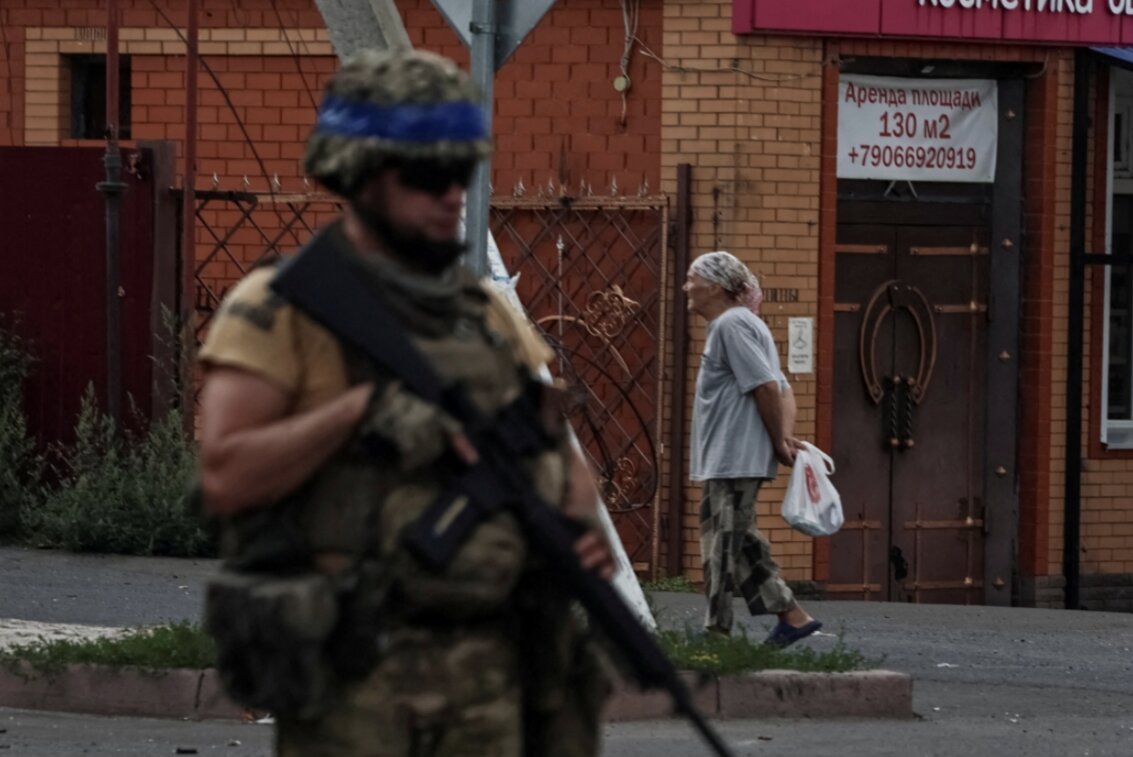 Binh lính Ukraine tuần tra ở thị trấn Sudzha. Ảnh: Reuters