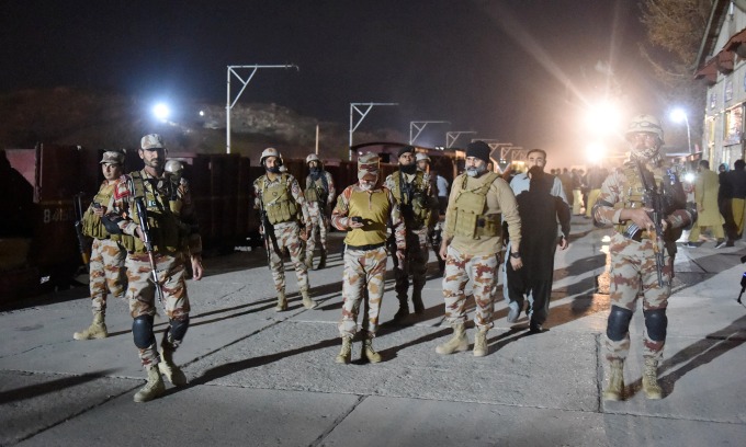 Binh sĩ Pakistan triển khai gần đường ray sau khi phiến quân chiếm đoàn tàu hỏa hôm 10/3. Ảnh: AFP