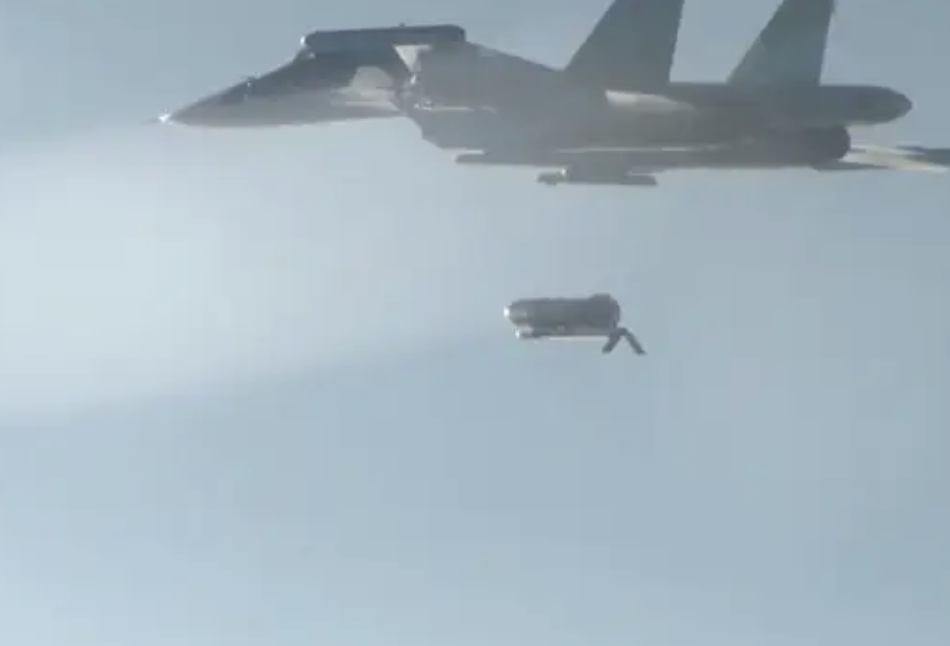 Tiêm kích ném bom Su-34 của Nga thả bom lượn FAB 3000. Ảnh: BQP Nga
