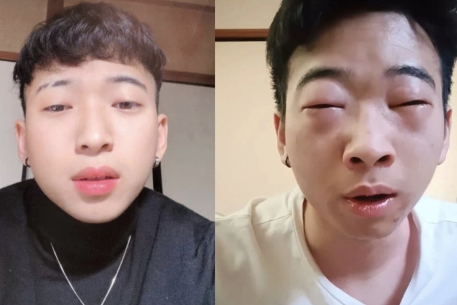 Văn Phong trước (trái) và sau (phải) bị dị ứng phấn hoa ở Nhật Bản, năm 2022. Ảnh: Nhân vật cung cấp